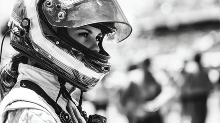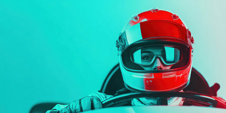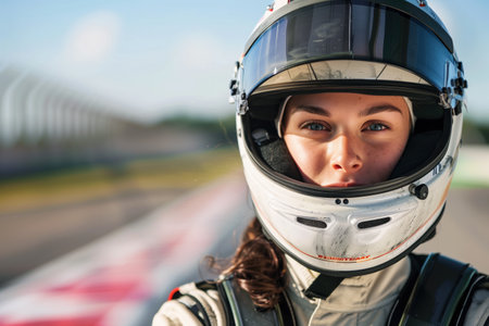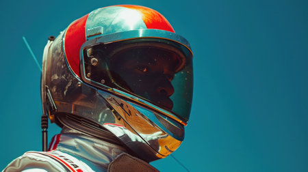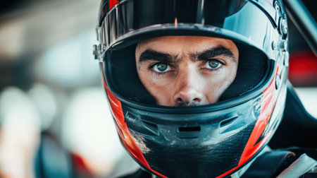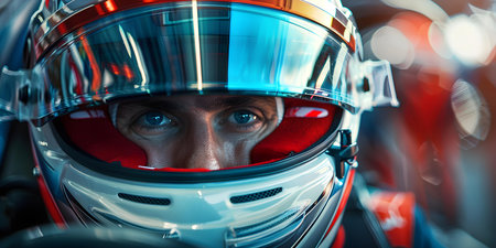 A close-up portrait of a race car driver wearing a helmet, ready for a high-speed race, exuding determination and focus. High quality photo