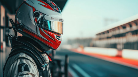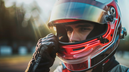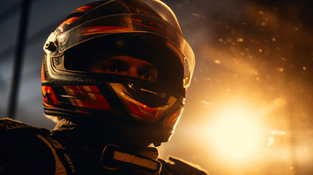 A focused professional racer wearing a helmet looks intensely ahead, ready to compete on the race track as the sun sets.
