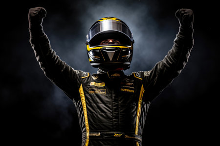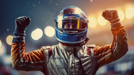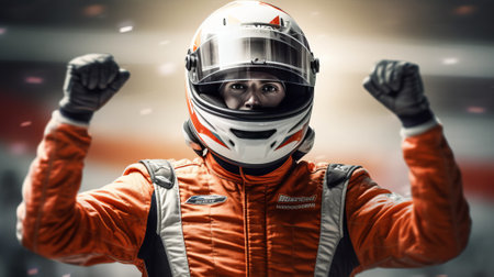 Racer celebrating victory on the race track in a suit. Generative AI.