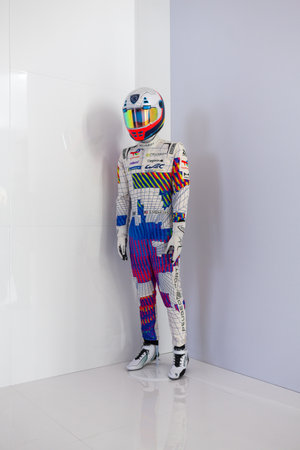 Milan, Italy - April 21, 2023: Costumes of racing pilots, Hypercar PEUGEOT 9X8 livery exposed at the Milan Design Week 2023