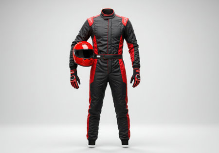 A full racing suit in black and red, complete with matching gloves and a red helmet, is presented against a clean white background, showcasing motorsport apparel.