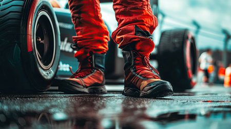 A professional F1 driver is captured standing at the starting line, preparing for an adrenaline-filled race