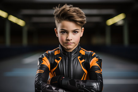 Portrait of a boy in a racing suit posing with arms folded