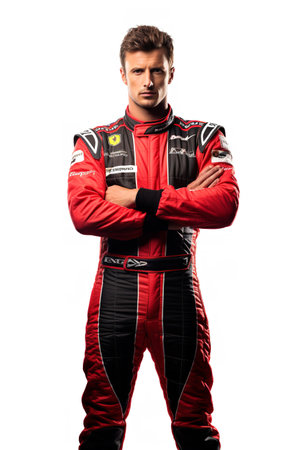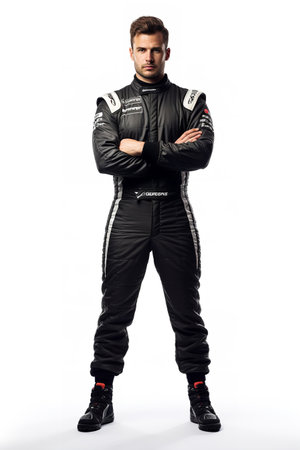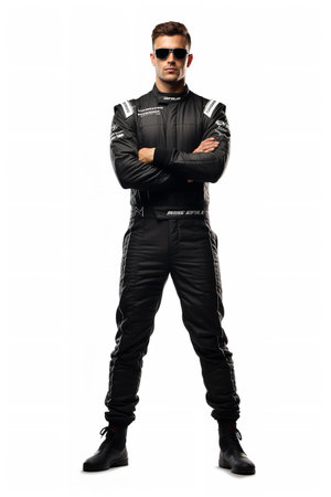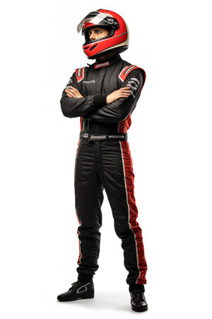 Full-length of racer standing with crossed arms, full gear, driver exudes calm and confidence, ready for any challenge on the track.