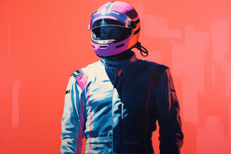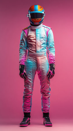 A person in a colorful racing suit and helmet stands against a pink background. Concept of extreme sport.