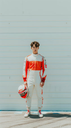 Young racer in white and red uniform, standing with helmet in hand, prepared for the intense speed and competition