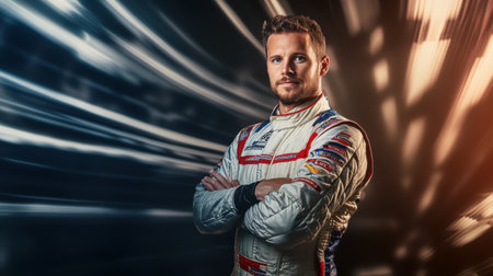 Confident racer in white suit with crossed hands standing against dynamic blurred background.