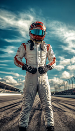 Male racer in racing suit and helmet poses confidently on the track at stadium event