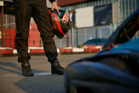 Cropped closeup shot of go-kart driver holding helmet in hands