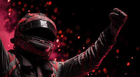A racing champion raises a fist in triumph, surrounded by sparks and colorful smoke, capturing the excitement of victory right after the race. The energy is palpable and electrifying.