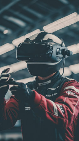 A man in a racing suit holding a remote control. Generative AI image.
