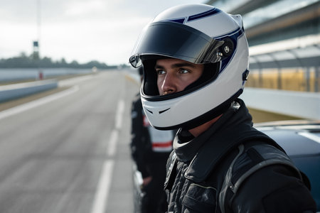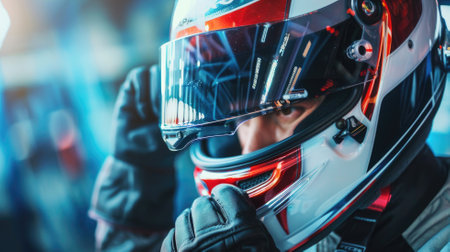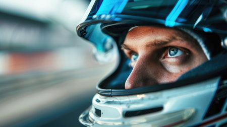A professional racer wearing a helmet looks intensely focused before the race, embodying determination and readiness for the competition.