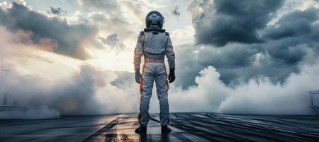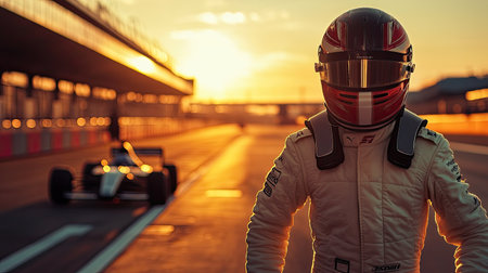 Formula One pilot on the racetrack at sunrise, heading toward his car with determination. A moment of ambition. Copy space