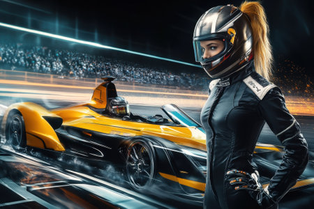 Racing driver walking on racetrack at night. Post-produced generative AI illustration.