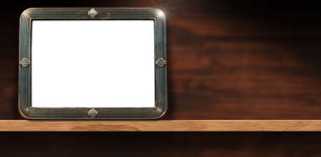 Closeup of an empty old fashioned silver picture frame on a wooden shelf with copy space. Photography.