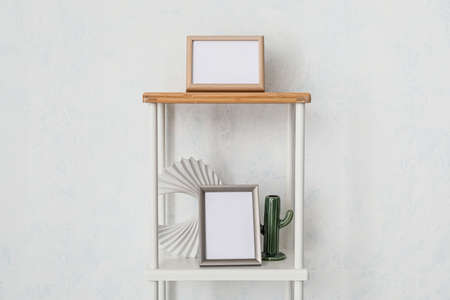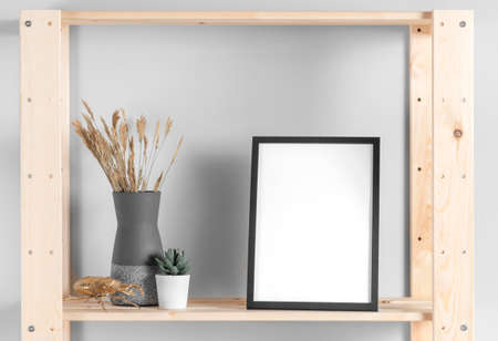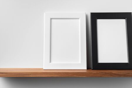 Design concept - front view of vertical white and black wood photo frame on bookshelf and white wall for mockup