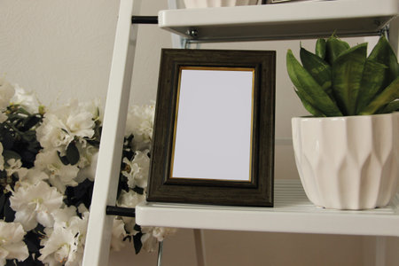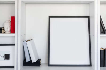 blank photo frame with copy space on white bookshelf at home