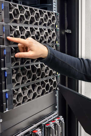 It engineer consultant install inserts a router switch in a rack Shot in a data center