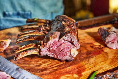 Grilled lamb spare ribs on wooden chopping board in restaurant