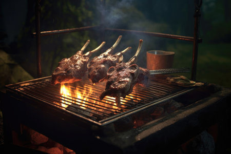 lamb chops on grill with glowing campfire and smoke, created with generative ai