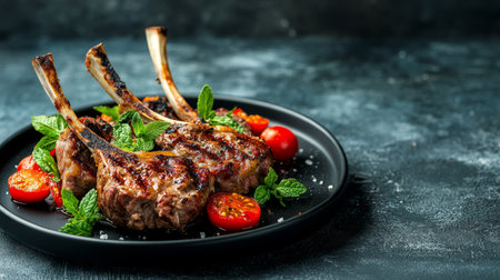 Juicy lamb chops arranged on dark slate, adorned with fresh rosemary. Ideal for food photography, grilling recipes, or culinary presentation. Perfect for chefs.