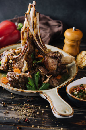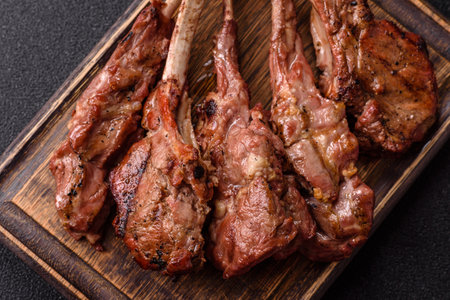 Lamb ribs grilled on the wood cutting board with spices and condiments. AI generated. closeup