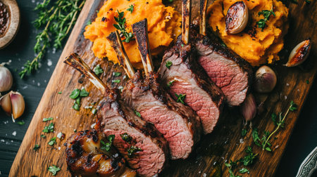 A visually appealing dish featuring tender lamb chops served on creamy mashed potatoes, garnished with fresh herbs and a rich sauce. Perfect for food enthusiasts.