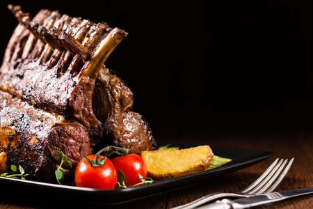 Roasted rack of lamb. Lamb chops on serving board and black wooden background. High angle view