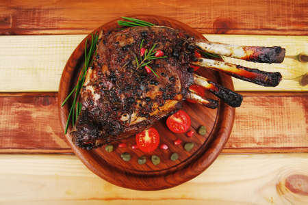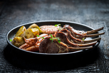 Roasted ribs of lamb with garlic and vegetables on burned table