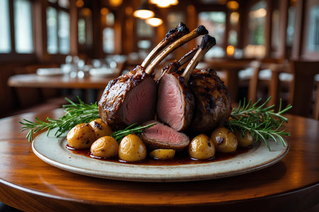 Roasted lamb chops with potatoes and rosemary on a wooden table