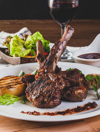 Enjoy a delicious plate of grilled lamb chops served with fresh vegetables and a creamy sauce, perfect for a gourmet dinner or special occasion.