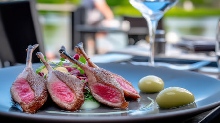 A beautifully plated dish of succulent lamb chops, cooked to perfection and presented with a vibrant salad and creamy dollops.