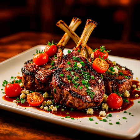 A mouthwatering plate featuring grilled lamb chops drizzled with savory sauce, garnished with fresh herbs, perfect for a gourmet dining experience.