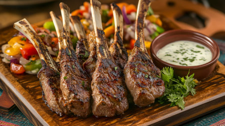 Perfectly grilled lamb chops on a wooden board, accompanied by fresh vegetables and garnished with herbs, ready to serve.
