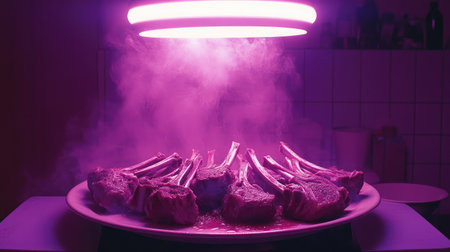 campfire smoke wafting around sizzling ribs, created with generative ai
