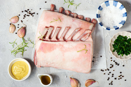 Raw fresh lamb ribs ready for roasting with spices and herbs..style hugge.selective focus