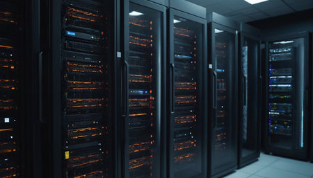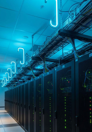 An intricate view of server racks in a data center, showcasing powerful hardware with vibrant green LED lights. This image highlights modern technology and infrastructure.
