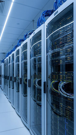 Rows of servers are presented in a dark, interior setting, suggesting a data center environment. The composition features a symmetrical perspective, with numerous interconnected cables and equipment. Blue and grey tones dominate the color palette, enhancing the modern and technological feel. This image is suitable for illustrating concepts of technology, data processing, and digital infrastructure.