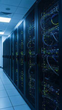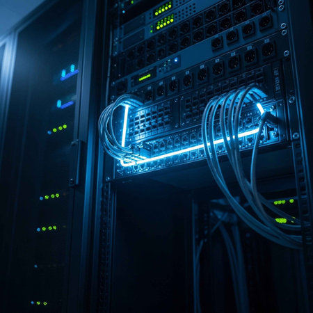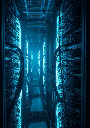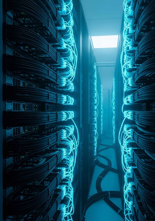 High-Tech Data Center Server Room with Network Cables and LED Indicators