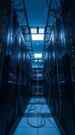 Server showing server room with rows of racks and tangled cables under blue lighting. resolution use.