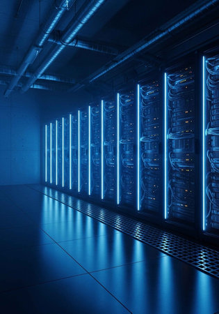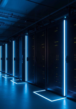 Image of a modern data center with rows of server racks illuminated with blue neon lights. The perspective creates a dramatic and technological feel, ideal for illustrating concepts related to