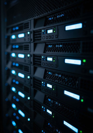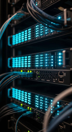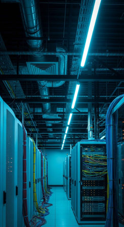 In the heart of a secure data center, a powerful server rack hums with activity, its components illuminated by a cool, futuristic blue light.