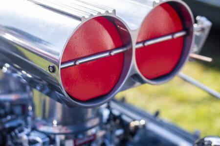 Detail of a motorcycle exhaust pipes and cylinders.
