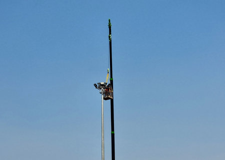 The crane lifting personnel baskets with two worker for sport light lamp installation at highway lighting pole on blue sky background.