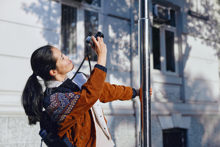 Woman photographer on a street corner, camera raised, scarf fluttering and jacket warm, daylight highlighting urban outdoors and candid moment, capturing a dynamic shot and textured scene
