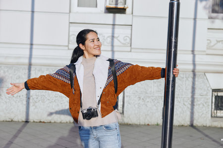 A woman with arms spread wide smiles while standing outdoors in a warm jacket and sweater on a sunny day, urban backdrop highlighting casual fashion and freedom