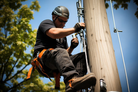 Male electrician wearing safety harness and hard hat climbing a utility pole, performing power line repair