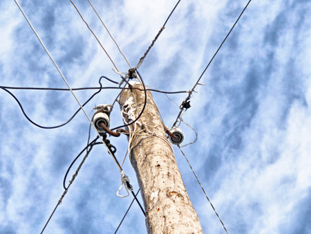Utility poles made of wood and concrete support power lines under a blue sky, showcasing electric infrastructure and energy distribution systems.