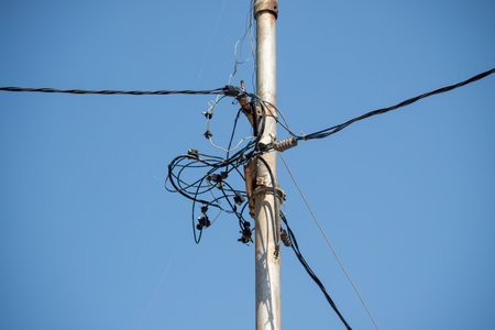 Close-up of a weathered telephone signal pole with wires against a blue sky, showcasing rural communication.