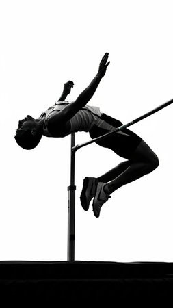 An athletic man clears a high jump bar in silhouette against a colorful sunrise sky while training alone at an outdoor stadium with a foggy track background.